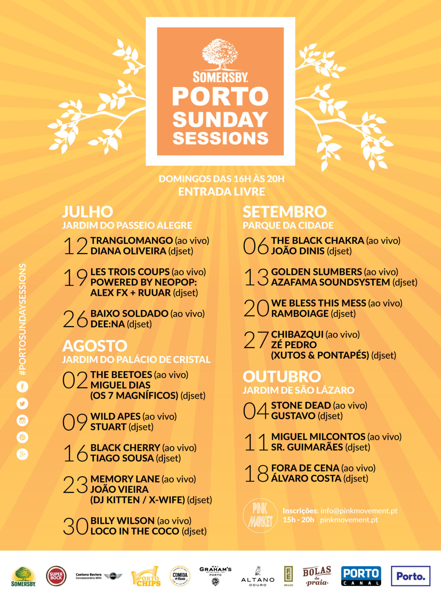 A 20 de setembro, com We Bless This Mess ao vivo e Ramboiage DJ set estão de volta as Porto Sunday Sessions ao Parque da Cidade. Aos domingos até 18 de outubro, entre DJ sets e concertos, vão continuar a animar os jardins do Porto, com fins de tarde de convívio e muita música. Parque da Cidade (setembro) e Jardim de São Lázaro (outubro). Na sua quarta edição, o evento volta a ter o apoio da Câmara Municipal do Porto. Todas as sessões serão acompanhadas pelo Pink Market, um mercado de arte, criatividade, produtos vintage e antiguidades. Entrada livre