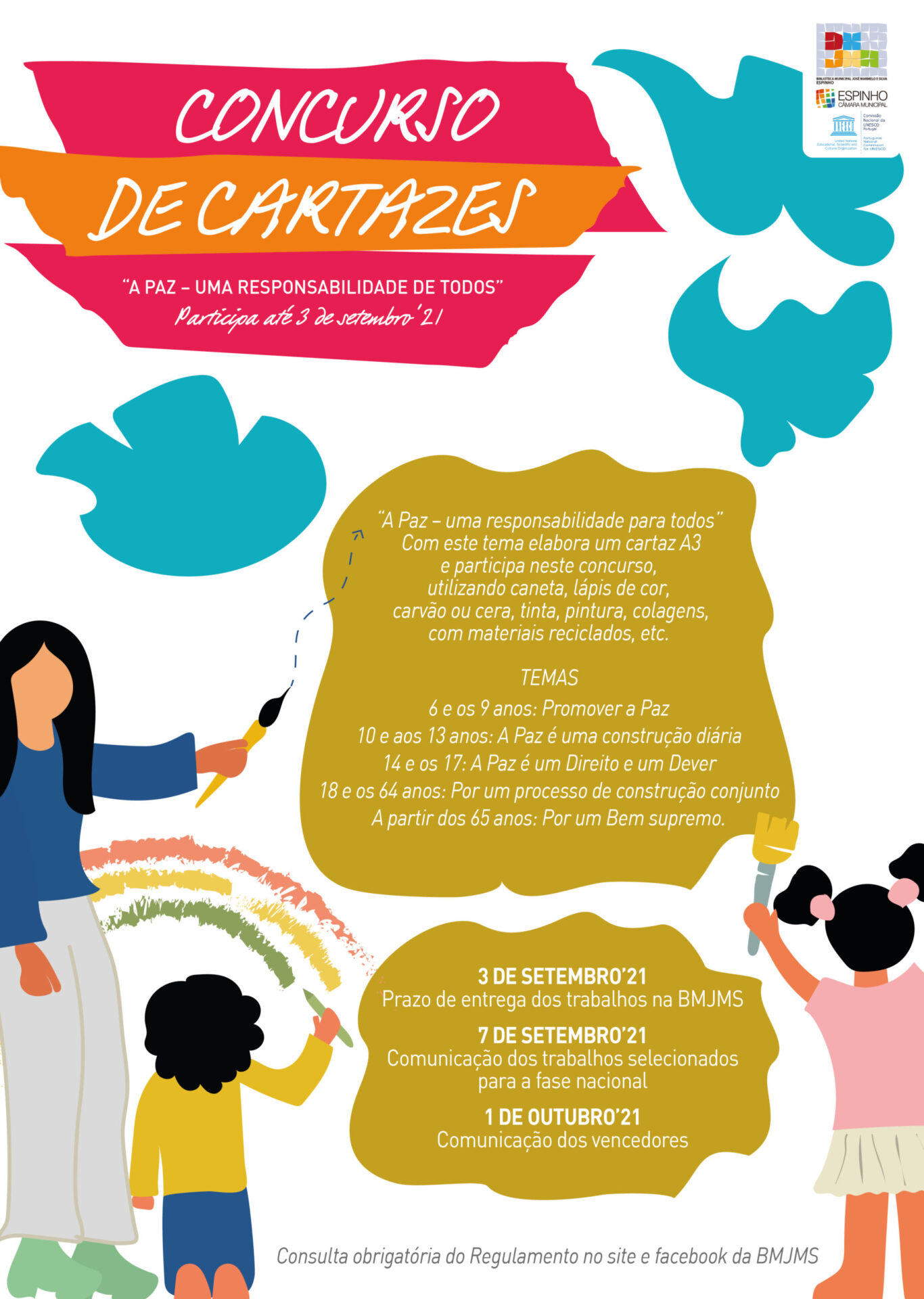 TEMAS Entre os 6 e os 9 anos Tema: Promover a Paz Entre os 10 e aos 13 anos Tema: A Paz é uma construção diária Entre os 14 e os 17 Tema: A Paz é um Direito e um Dever Entre os 18 e os 64 anos Tema: Por um processo de construção conjunto A partir dos 65 anos Tema: Por um Bem supremo. Prazo de entrega dos trabalhos na BMJMS | 3 de setembro 2021 Comunicação dos trabalhos selecionados para a fase nacional | 7 de setembro 2021 Comunicação dos vencedores | 1 de outubro 2021 Consulta obrigatória do Regulamento | Site e facebook da BMJMS Join this competition by creating an A3 poster under the theme “Peace – Everyone’s Responsibility”. You can use pen, colour pencils, charcoal or crayons, ink, paintings, collage, recycled materials, etc. THEMES Age 6-9: Promoting Peace Age 10-13: Peace is a Daily Construction Age 14-17: Peace is a Right and a Duty Age 18-64: For a joint construction process Age from 65: For a Supreme Good Delivery of the posters in the José Marmelo e Silva Municipal Library (BMJMS) - until 3/9/2021 Information on the works selected to participate in the national competition – 7/9/2021 Information on the winners – 1/10/2021 The Regulation must be consulted in the BMJMS’s website and Facebook page (in Portuguese) Participe en este concurso creando un cartel A3 bajo el tema “La Paz – Una responsabilidad de todos”. Puede utilizar bolígrafo, lápiz de color, carboncillo o cera, tinta, pintura, colagge, materiales reciclados, etc. Temas: 6-9 años: Promover la Paz 10-13 años: La Paz es una construcción diaria 14-17 años: La Paz es un derecho y un deber 18-64 años: Por un proceso de construcción conjunto A partir de los 65 años: Por un bien supremo Entrega de los trabajos en la Biblioteca Municipal José Marmelo e Silva (BMJMS) – hasta el 3/9/2021 Comunicación de los trabajos seleccionados para la fase nacional – 7/9/2021 Comunicación de los vencedores – 1/10/2021 El reglamento deberá ser consultado en el sitio y en la página de Facebook de la BMJMS (en portugués)