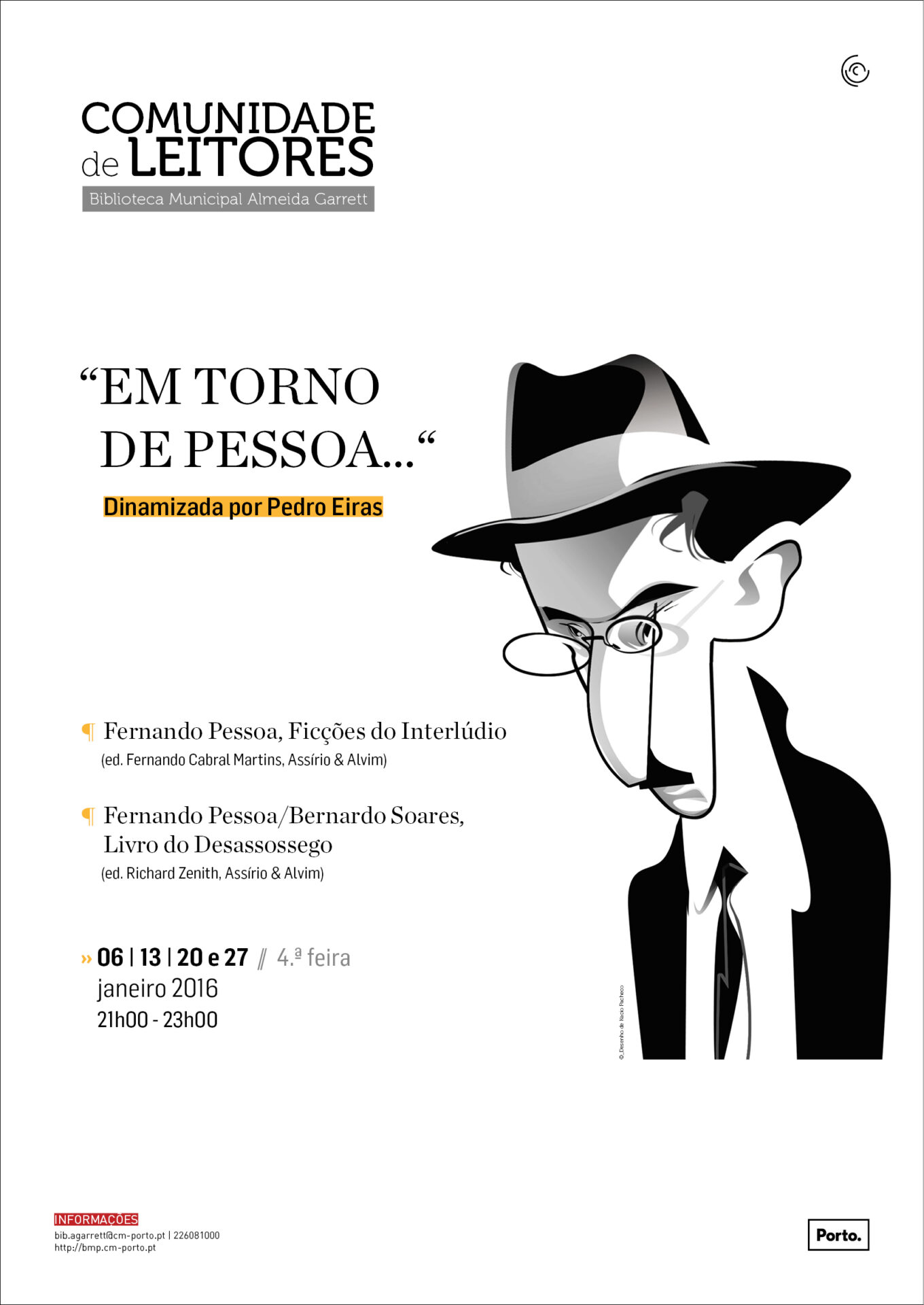 Decorre em Janeiro mais um ciclo da Comunidade Leitores da BMAG, agora - “Em torno de Fernando Pessoa” - sob a orientação de Pedro Eiras. Esta atividade organizada desde 2002, tem contribuído para a promoção e partilha de leituras proporcionando agradáveis momentos de debate. Propõe-se a leitura das obras: Fernando Pessoa, Ficções do Interlúdio (ed. Fernando Cabral Martins, Assírio & Alvim); Fernando Pessoa/Bernardo Soares, Livro do Desassossego (ed. Richard Zenith, Assírio & Alvim). Ao longo das quatro sessões fala-se sobre Fernando Pessoa ortónimo, Alberto Caeiro, Álvaro de Campos e Bernardo Soares.