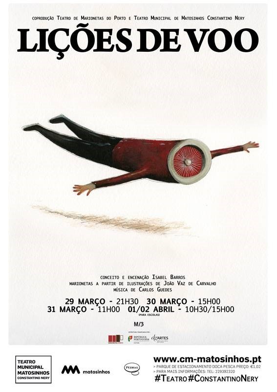 Lições de voo é o nome de uma série de ilustrações de João Vaz de Carvalho, as quais serão usadas para a criação do espetáculo com o mesmo nome. Esta ideia dá sequência a uma experiência de colaboração realizada em 2013 em Pelos Cabelos, a qual se revelou muito estimulante. Espetáculo para dois atores, com marionetas e semi marionetas, cujo conceito é o desejo de voo, o secreto desejo humano de realizar o irrealizável.   Poética recorrente no trabalho da encenadora, que tem percorrido e explorado esse território em formatos muito diversos. É também, pela experiência de cruzamento multidisciplinar que as marionetas tanto a inspiram e têm sido matéria central, capaz de responder às suas motivações criativas.   Lições de voo, é uma criação para maiores de 3 anos sobre a poética do ar, dos sonhos e do voo, num lugar especial onde cada um pode experimentar a leveza do corpo, a suspensão e a emoção de descolagem.   Lições de voo é a nossa viagem com o público até lá, onde todos somos pessoas/pássaros do vento.   Ficha artística e técnica Conceito e encenação – Isabel Barros Marionetas a partir de desenhos de João Vaz de Carvalho Música – Carlos Guedes Desenho de luz – Filipe Azevedo Figurinos – Cláudia Ribeiro Cenografia – Coletivo Criação de textos – Isabel Barros, Micaela Soares e Vítor Gomes Adaptação para Língua Gestual Portuguesa – Joana Cottin Preparação vocal – Shirley Resende Interpretação – Micaela Soares e Vítor Gomes Produção – Sofia Carvalho Designer gráfico e assistente de produção – Pedro Ramos Operação de luz e som – Filipe Azevedo Técnicos de construção – João Pedro Trindade e Hernâni Miranda Construção de cenografia – Carlos Lima Confeção de figurinos – Marlene Rodrigues (costureira), Sofia Silva e Inês Mota (aderecistas) Fotografia de cena – Susana Neves Duração – 50’ Sem intervalo Coprodução Teatro de Marionetas do Porto e Teatro Municipal de Matosinhos Constantino Nery Agradecimento especial aos 20 participantes nas Oficinas de Escrita Lições de voo – Alice Martins, António Araújo, David Martins, Duarte Martins, Gonçalo Silva, Helena Zorzan, Henrique Zorzan, João Vasconcelos, Leonor Mendonça, Luís Magalhães, Mafalda Monteiro, Maria Teixeira, Matias Alves, Miriam Mata, Rita Silva, Rui Macedo, Salvador Fonseca, Sofia Bessa, Tomás Bernardino e Tomás Leitão Preço dos bilhetes Preço dos bilhetes 7,50€. Para crianças até aos 14 anos, estudantes e maiores de 65 anos: 5€, Desconto de 20% para compras superiores a 10 bilhetes