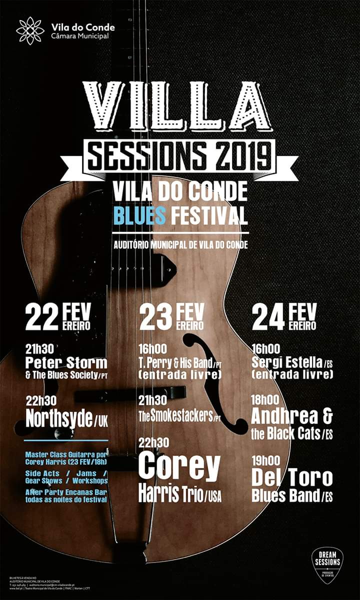 A 3ª edição apresenta um cartaz com nomes internacionais, dos quais se destaca Corey Harris, ao qual se juntam os Ingleses Northsyde e a “armada espanhola” com Sergi Estella, Andhrea & the Black Cats e Del Toro Blues Band. Continuando também a apostar no Blues nacional, poder-se-á disfrutar com os sons de Peter Storm & The Blues Society, T. Perry & His Band, The Smokestackers, entre outras surpresas. Nomes que honrarão o que de melhor se faz por cá neste gênero musical.   Um fim de semana em grande, com muito Blues, conta também com Master Class de guitarra por Corey Harris, jams, gear shows, workshops, degustações, momentos de dança e after party todas as noites do Festival.   O   Vila do Conde Blues Festival-Villa Sessions é organizado pela Dream Sessions, com o apoio principal da Câmara Municipal de Vila do Conde, e de outras entidades imprescindíveis à sua realização e promoção.        Bilheteira:   Dia 22, sexta-feira - 10€   Dia 23, sábado - 10€   Dia 24, domingo - 8€   Pack Festival para os 3 dias - 25€    Programa:   Dia 22 de fevereiro   21h30 Peter Storm & The Blues Society   22h30 Northsyde    Dia 23 de fevereiro    16h00 T. Perry & His Band (outside, free concert)   21h30 The Smokestackers    22h30 Corey Harris Trio    Dia 24 de fevereiro   16h00 Sergi Estella (outside, free concert)   18h00 Andhrea & the Black Cats   19h00 Del Toro Blues Band